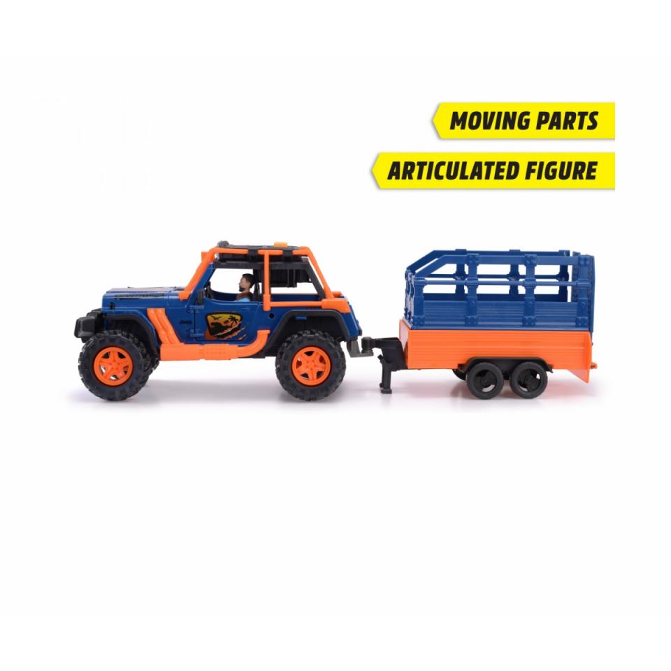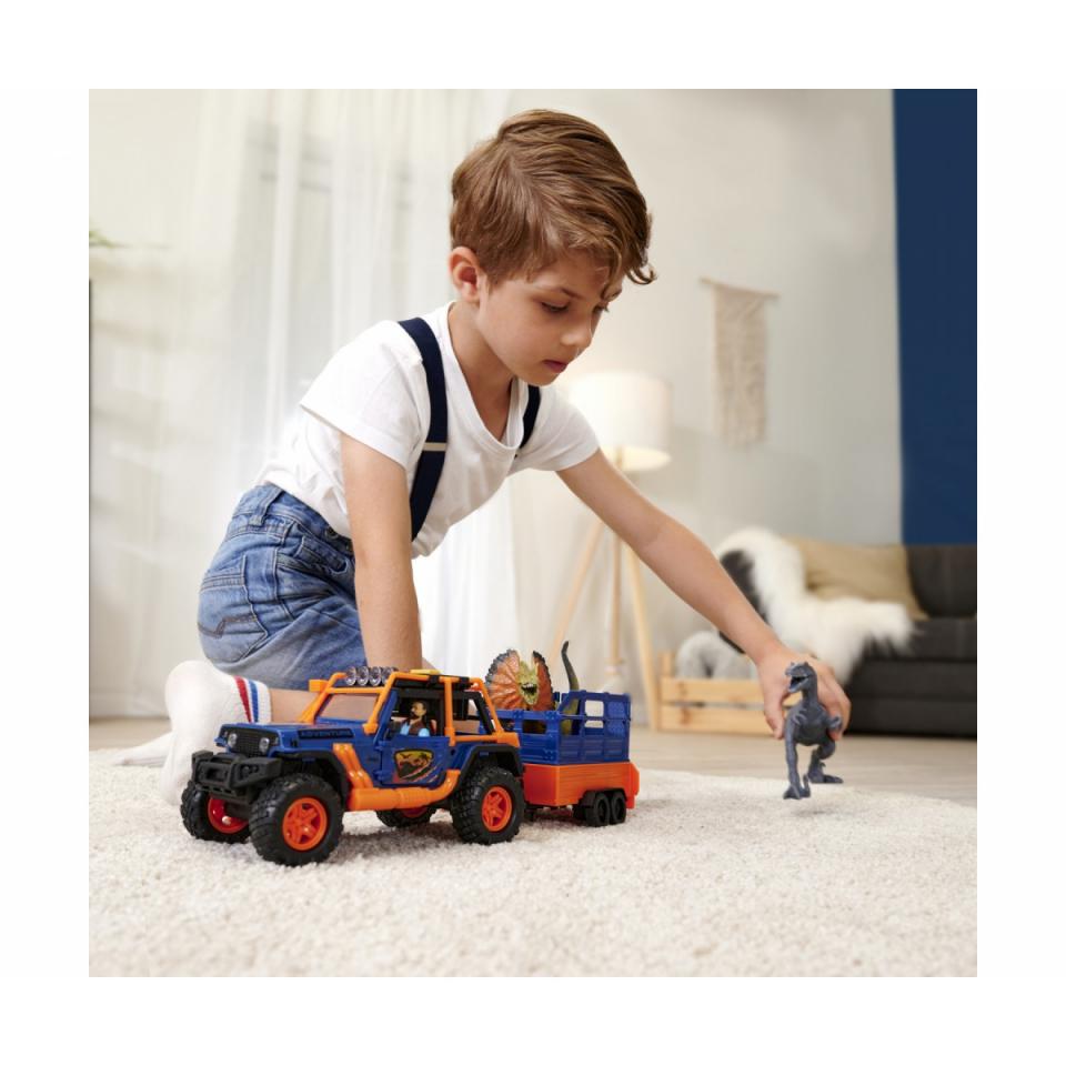 Dickie Toys – Dino Commander (40 cm) – Spielzeug-Auto „Jeepster Commander inkl. Anhänger mit Figur plus 2 Dinosaurier – Spielzeug für Kinder ab 3 Jahren • Die Dinos sind los! – Mit seinem Geländewagen „Jeepster Commander (Original Jeep-Lizenz im Maßstab 1:24) samt Anhänger mit Käfig macht sich der Ranger auf die Suche nach den Riesenechsen. • Jeep fürs wilde Gelände – Der Freilauf-Geländewagen ist das richtige Gefährt für die raue Natur: gefederte Gummireifen, öffnende Türen, Tuning-Teile und Licht & Sound (inkl. Batterien) • Plus 2 Dinosaurier – Neben dem Spielzeugauto und dem Anhänger mit Käfig und Laderampe sind im Spielzeug-Set eine bewegliche Spielzeug-Figur sowie zwei Dinosaurier enthalten. • 2 Lieblingsthemen kombiniert – Autos & Dinos: Was braucht es mehr, um Jungen und Mädchen zu begeistern und zu beschäftigen Das Dinosaurier-Spielzeug ist das ideale Geschenk für Kinder ab 3 Jahren! • Über Dickie Toys – Die Fahrzeugmarke für Kinder! Wir haben immer ein Ziel vor Augen: Kindern ein Lächeln ins Gesicht zu zaubern. Einfach auspacken und los geht der Spaß! Zurück in die Zeit der Dinosaurier mit dem Dino Commander von Dickie Toys! Dieser offiziell lizenzierte Jeep ist das perfekte Geschenk für kleine Autofans, die Dinos lieben und mutig genug sind, sie zu transportieren. Dafür steht ein Spielzeugauto mit liebevollen Details sowie ein großer Anhänger mit Käfig zur Verfügung. Die zwei enthaltenen Dinos können so kinderleicht von einem Ort an den anderen gebracht werden – weiche Reifen sorgen außerdem dafür, dass der Jeep dabei nicht vom Weg abkommt. Zum Spielen animieren Licht und Sound, die kinderleicht über die Taste eingeschaltet werden können und die Fantasie Ihrer Kids anregen. Dank der Türen, die nach Belieben geöffnet und geschlossen werden können, sind die Dinos sowie Kleinigkeiten schnell und sicher verstaut. Damit der Spaß sofort losgehen kann, ist außerdem eine knickbare Figur enthalten. Auf geht’s, Commander! • Dino Commander mit Freilauf • Licht und Sound • Zwei Dinos inklusive • Gesamtlänge 40 cm • Maßstab 1:24 • 3x 1,5 V LR44 Batterien enthalten • Für Kinder ab 3 Jahren geeignet Dickie Toys – Vielfalt die seit über 50 Jahren überzeugt Ob einfach mechanisch oder technisch komplex – die Faszination für alles was fährt, schwimmt oder fliegt, ist bei Dickie Toys deutlich spürbar. Bagger, Polizei oder Feuerwehr – Dickie Toys inszeniert die Realität auf mitreißende Weise und ermöglicht den Kleinen, die weite Welt mit leuchtenden Augen zu entdecken.