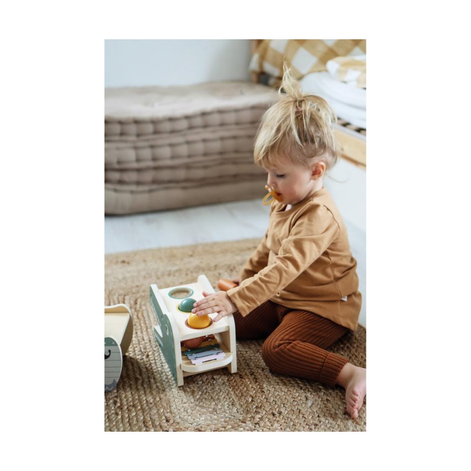 Klopf- und Klang-Spaß für die Kleinsten! Dieses niedliche Krokodil aus robustem Holz macht als Klopfspiel mit integriertem Xylophon gleich doppelt Spaß. Die drei Holzkugeln lassen sich mithilfe des Hammers durch die Öffnungen auf der Oberseite klopfen und erzeugen dabei auf dem darunter befindlichen Xylophon beim Herabrollen aufregende Klänge. Ein besonderer Clou: das kindgerechte Xylophon mit farbkodierten Klangstäben kann seitlich aus dem Klopfspiel entnommen und separat bespielt werden. Diese Klopfbank ist ein Krokodil und bietet den idealen Einstieg in die Welt der Klänge! Das Xylophon trainiert beim Musizieren neben der akustischen Wahrnehmung auch spielerisch Rhythmus- und Taktgefühl und ein erstes Verständnis für Töne und Tonleitern. Die Klopfbank schult die motorischen Fähigkeiten und vermittelt spielerisch das Prinzip von Ursache und Wirkung. Ein vielseitiger Motorikspaß mit Lern- und Aha-Effekt! ACHTUNG! Nicht in Ohrnähe anwenden. Missbrauch kann zu Gehörschäden führen.